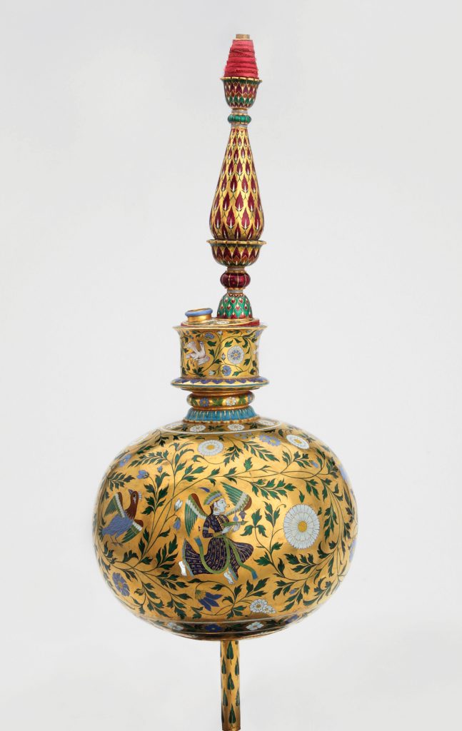 With birds, flowers, and winged figures offering gifts, this shisha pipe is a very extravagant example of Mughul aesthetic sensibilities. Much like other Mughul items, the use of gold is incredibly prominent.