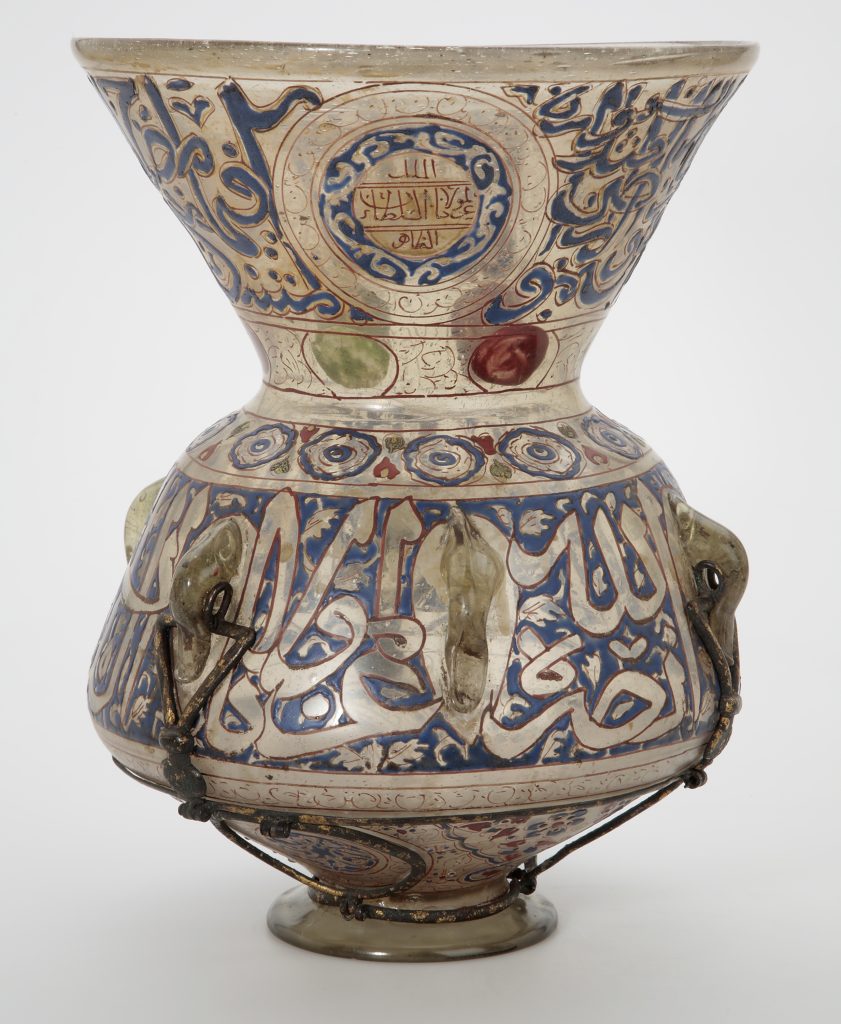 This Mamluk-era glass lamp that would have adorned the walls of a mosque and others like it became a distinctive and iconic part of Islamic art. While mostly associated with Egypt, this type of glass mosque lamp could also be found in other Arab capitals. The interest in these objects and admiration for the carefully painted calligraphy by Western audiences in the 19th century led to several glass factories in Paris and Austria to actually make fakes and imitations to sell to collectors.