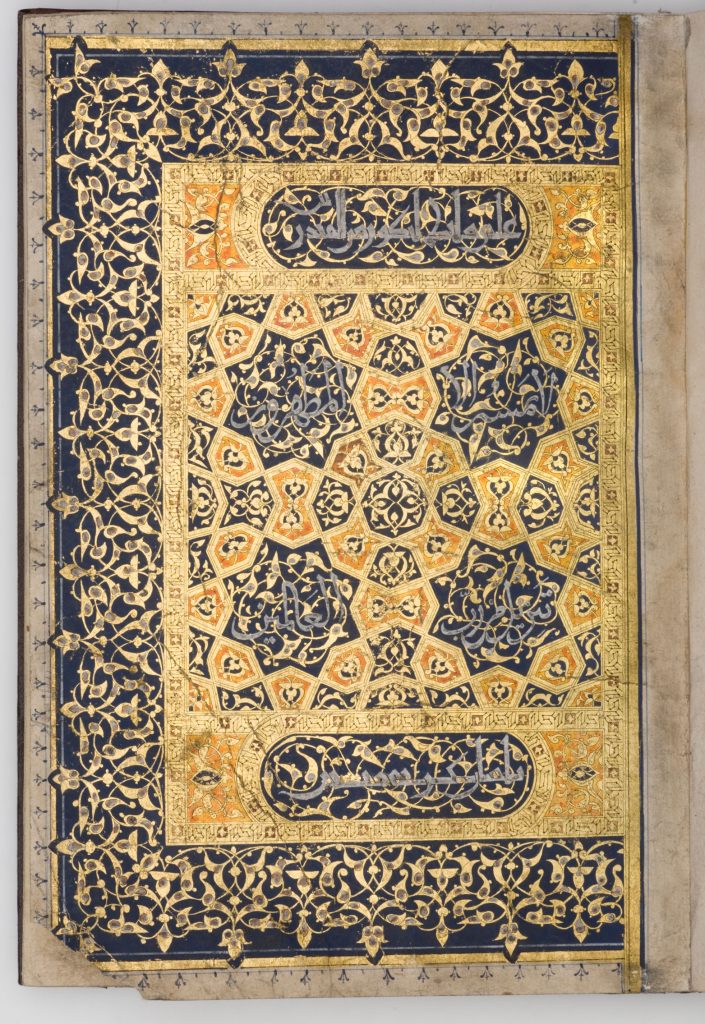 Bearing the signature of the artist, Ahmad ibn ‘Ali al-‘Ajami, who in this particular context is usually described as an illuminator, this decorated page of the Quran is impressive in both its beauty and the skill needed by the craftsmen. With the use of real gold leaf, pages such as these are painstakingly produced over several days, if not weeks.