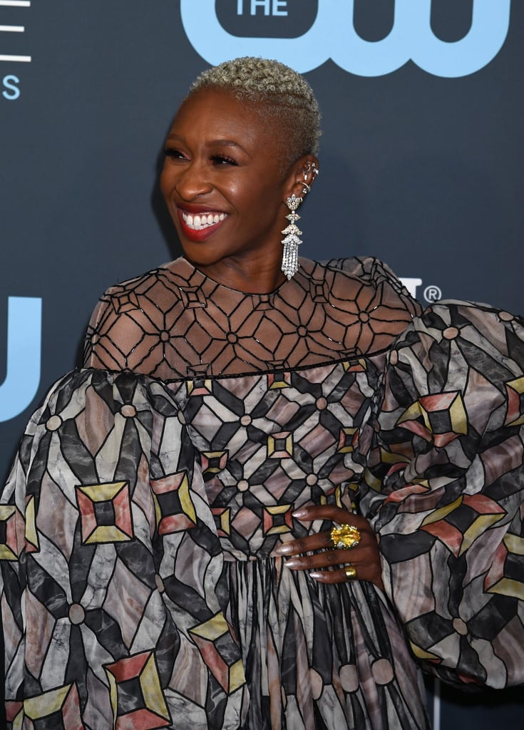 Cynthia Erivo marble mosaic print dress was a true stunner at the Critics’ Choice Awards. The Fendi gown featured voluminous sleeves and a dramatic train. She completed the look with stunning silver dangly earrings and a statement canary yellow ring, both by David Webb.