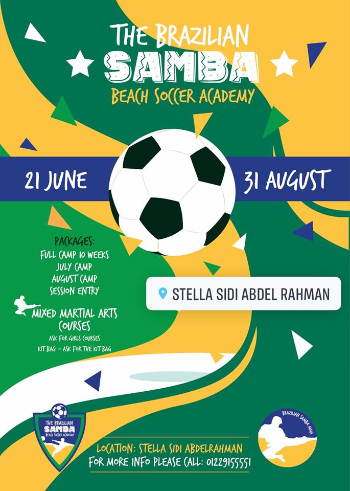 The academy will be operating from the 21st of June at Stella Sidi Abdel Rahman. It offers three programs: Beach soccer and mixed martial arts academies suitable for boys and girls, in addition to a cheerleading academy for girls. For registration, contact Brazilian Samba Academy here.