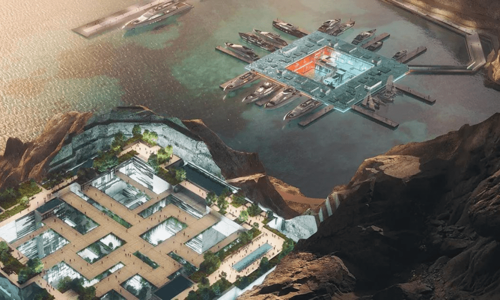 Described as an “experiential space embedded within the mountains,” NEOM’s Aquellem is a hotel that’ll literally be hidden within a 450-meter-high mountain. Giving guests the feel of being in a spy movie, accessing the hotel requires a boat ride through an underground canal to enter its interiors.