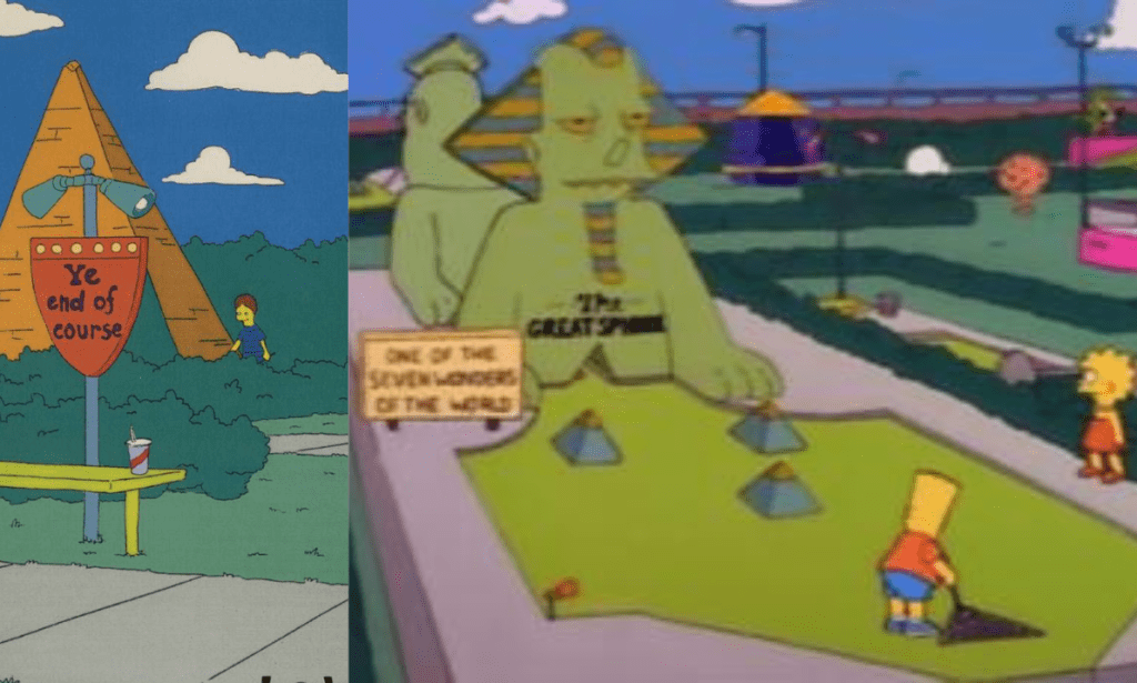 In the sixth episode of Season 2, when the family decides to go play mini golf, one of the many courses is a recreation of the Sphinx but with the face of a dopey Simpson. There are also zig zagging mini pyramids that lead up to the Sphinx.
