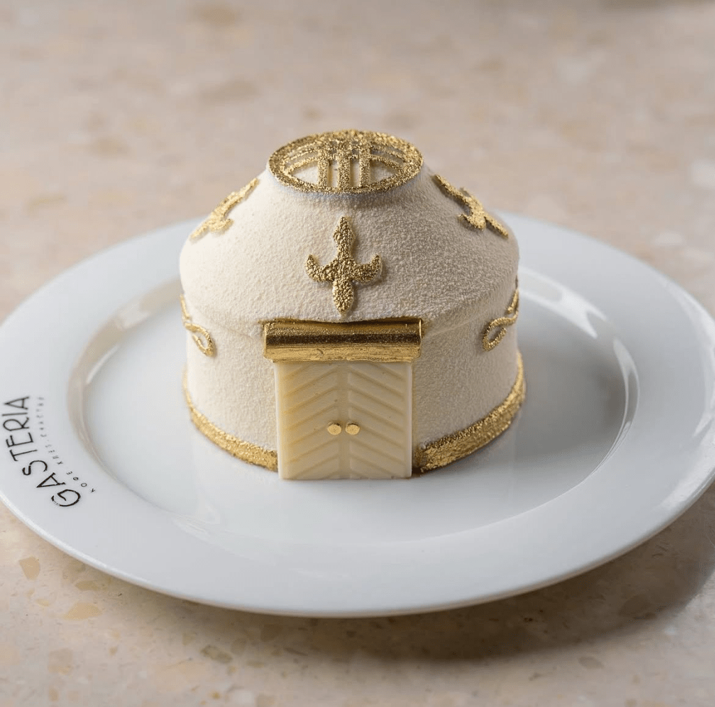 Gasteria was born in Kazakhstan, and its founders haven’t forgotten their roots. One of the most memorable items on the menu is the Yurta dessert — a sweet, sculptural tribute to the Kazakh yurt, the traditional round dwelling used by nomadic tribes.