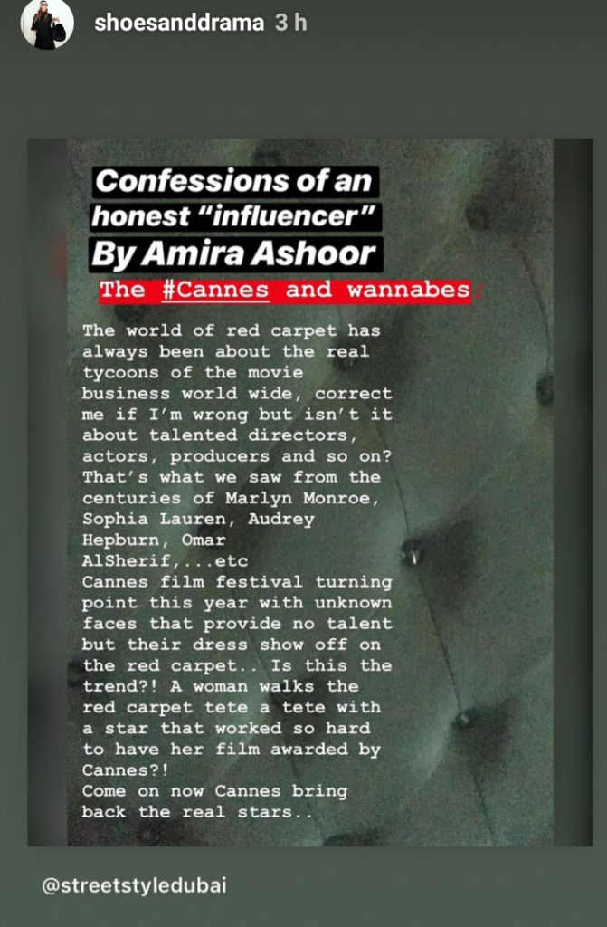 Fellow blogger and founder of Street Style Dubai, Amira Ashour, shared her two cents on the matter as well. The mere thought of a nameless lady with a pretty dress allowed to walk the same red carpet as some of the film industry’s tycoons did not go well with her.