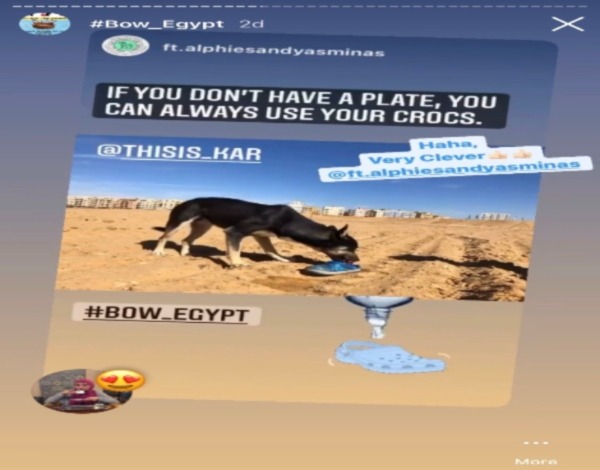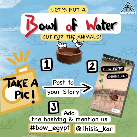 As the heat waves become more apparent throughout the region, and our air conditioners are turned on full blast, there are those, the voiceless, who endure the scorching heat, fighting every day to sustain their families as well as themselves. Our beloved stray animals and the birds that soar above the Egyptian skies do not have access to clean water often, and as the temperatures get warmer, access to more clean water is more urgent than ever. However, there is one unsung hero throughout this matter. British-Egyptian Sara Alashri, a Cairo resident who has previously worked for the Dubai-based Furs and Feathers Magazine as a writer/illustrator, took to the social media stage, bringing to life the animal awareness page BOW (Bowl of Water) and the KAR (Kids Acting Responsibly) initiative.