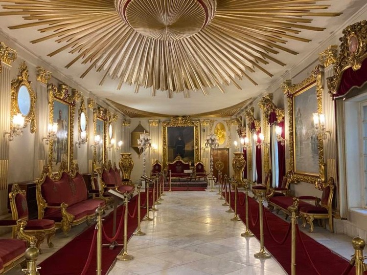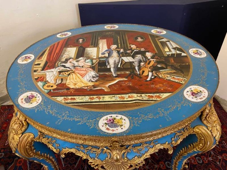 We must emphasize though that the 119th anniversary of the palace’s founding is being commemorated by the exhibition, which we must describe as a precious heritage. The pieces shown in the seized antiquities exhibition include the golden cradle of King Farouk, made of gilded wood and engraved with his monogram. It was seized in the cargo village at Cairo International Airport in 2010. Another painted European-style porcelain table depicting two women watching three men playing musical instruments was discovered in a furniture container at Damietta seaport.