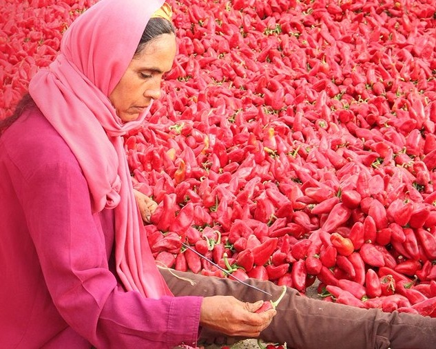 Ubiquitous and infamous across Tunisia, harissa is a seasoning made with chili pepper paste that plays an integral role in the culinary world of Tunisian society. An elaborate series of steps are involved in the picking and creation of this special culinary seasoning. It all starts with picking the chili peppers then drying them in the sun, splitting the peppers, removing the stalks, and deseeding them.