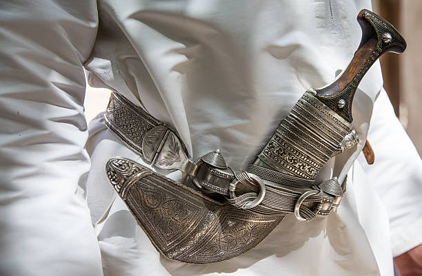 During the festivities of national events or special occasions like weddings, the dagger known as the khanjar is known to be a part of the traditional dress worn by Omani men. Worn around the waist and secured with a belt, the khanjar consists of a handle, blade, scabbard, and cover all of which are usually made from wood, cloth, silver, or leather.
