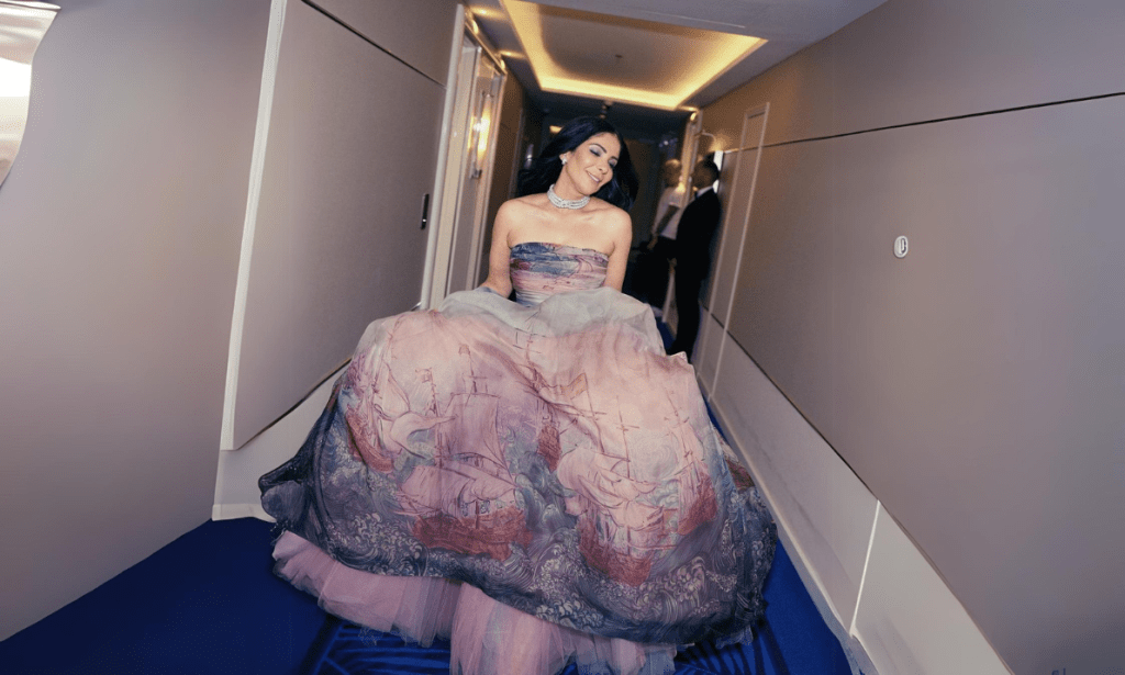 What felt like a painting coming to life, Zaki arrived on the red carpet in a strapless Zuhair Murad creation in two shades: dusty rose and deep inky blue. The true masterpiece, though, was the print on her skirt, which depicted a scene of sailing ships across swirling waters.