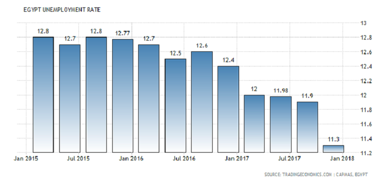 Egypt’s unemployment rate fell to 11.8 percent in the fourth quarter of 2017 from 12.5 percent in the third quarter of 2017, state statistics agency CAPMAS said on Monday.