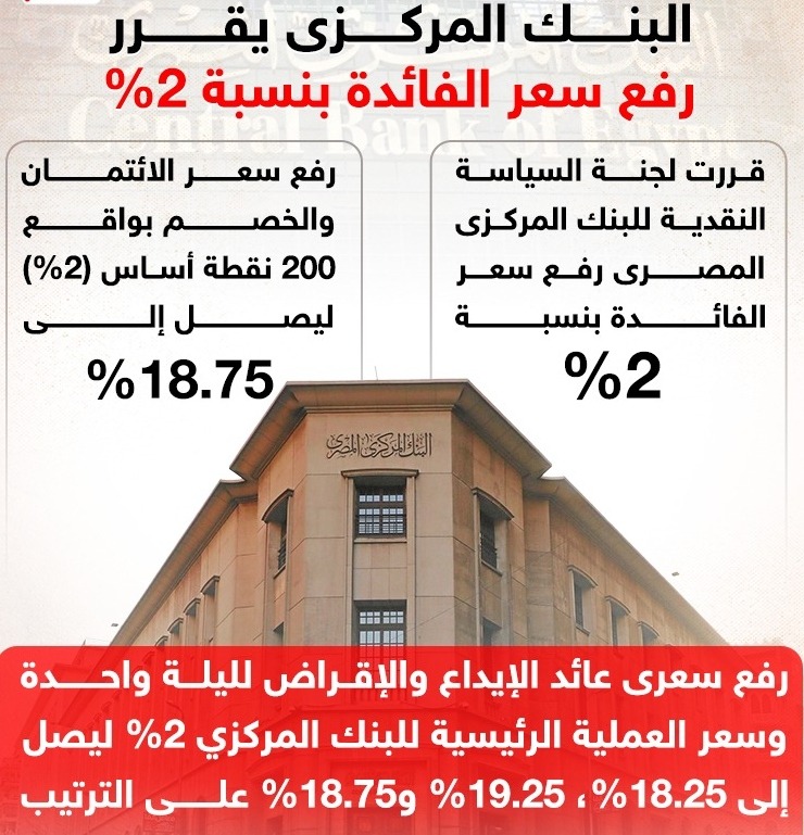The Central Bank Of Egypt increased interest rates by two percent (200 bps) which means that the overnight deposit rate, overnight lending rate, and the rate of the main operation were raised to 18.25 percent, 19.25 percent, and 18.75 percent respectively. This is all part of an effort by the Central Bank to lower inflation rates to specific target levels.