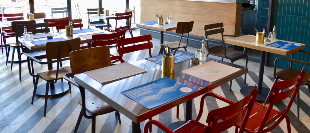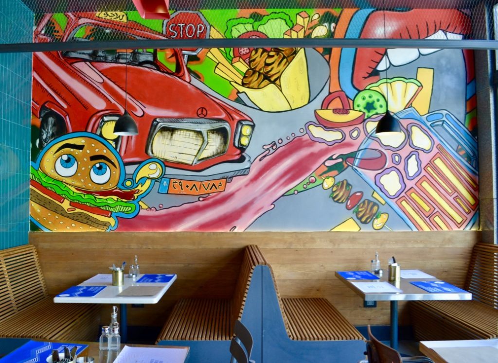 The colorful graffiti hand-painted by one of the city’s top local artists on the diner’s wall plays off well with the colorful chairs and lamps, giving it an upbeat and contemporary vibe.