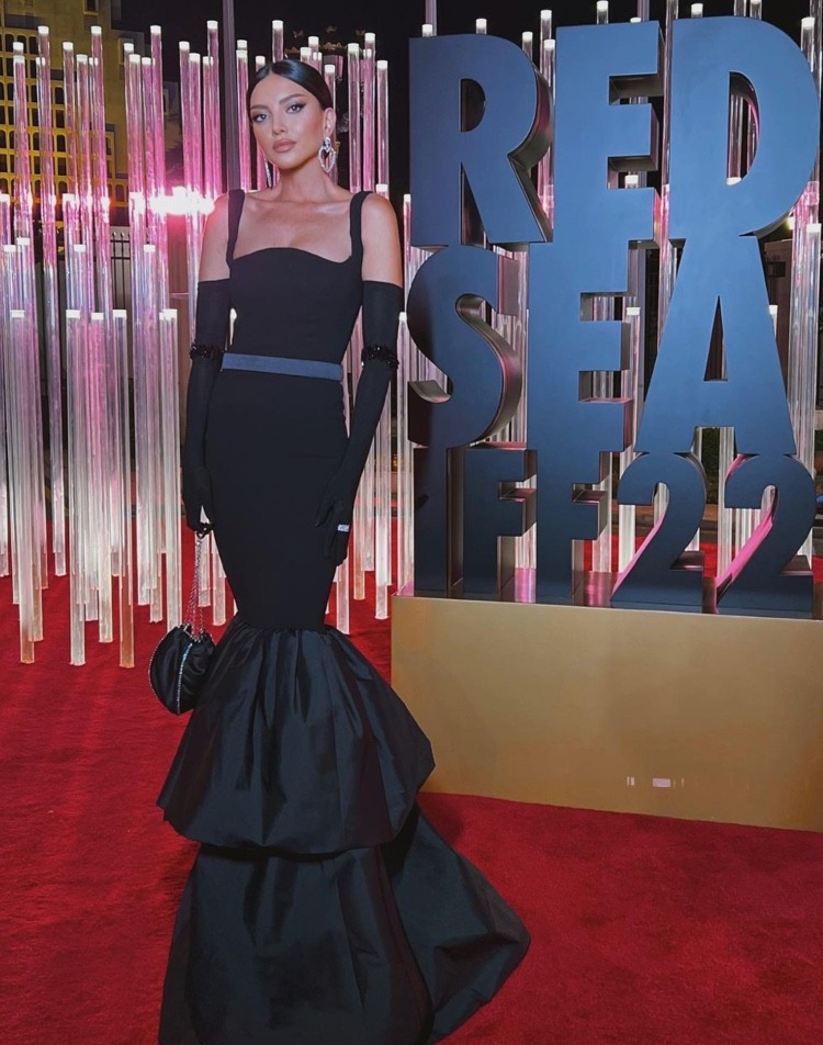 Saudi Arabian actress, Mila Al-Zahrani looked stylish in a sleek black-and-white gown from the label Mashael Al Faris. Al Faris is a Saudi fashion designer specializing in high-end designs. Back in 2019, the uniform worn by women organizers and receptionists at the foundation stone laying ceremony of Diriyah Gate was the innovative work of none other than, Al Faris. The credit went to her for accomplishing the total work of the uniform, from drawing, selecting materials, and knitting in a short period of two weeks. She designed a costume incorporating features of modern fashion design in a way matching fully the historical designs of Diriyah.