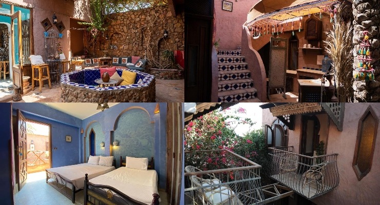 Small and intimate, this Arabian-style 7 guest room boutique hotel located in the center of Dahab exudes a down-to-earth vibe. It brings in touches of Moroccan architecture with its central courtyard (termed riad in Moroccan) featuring a blue mosaic fountain in its center. Inside, its pink clay walls and mosaic-decorated staircase also add to its Arabesque character as well as the decor of each of its guest rooms; said to be inspired by the tales of Alf Leila We Leila with their Islamic, ogee archways and star-shaped copper hanging lights.