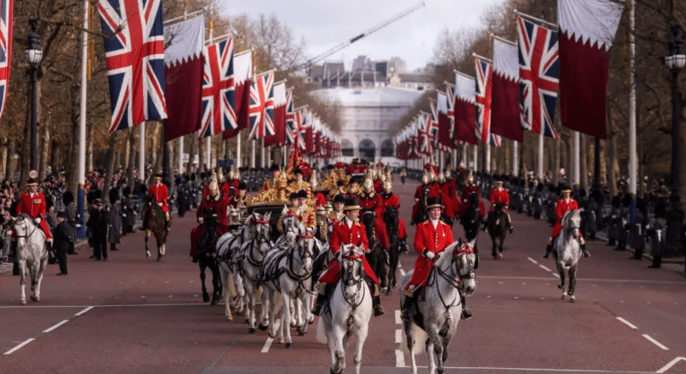 Qatar’s Emir Sheikh Tamim bin Hamad Al Thani began his official visit to the UK with a ceremonial reception in London. King Charles III formally greeted the Emir and Sheikha Jawaher bint Hamad bin Suhaim Al Thani at Horse Guards Parade, followed by a traditional carriage procession to Buckingham Palace.
