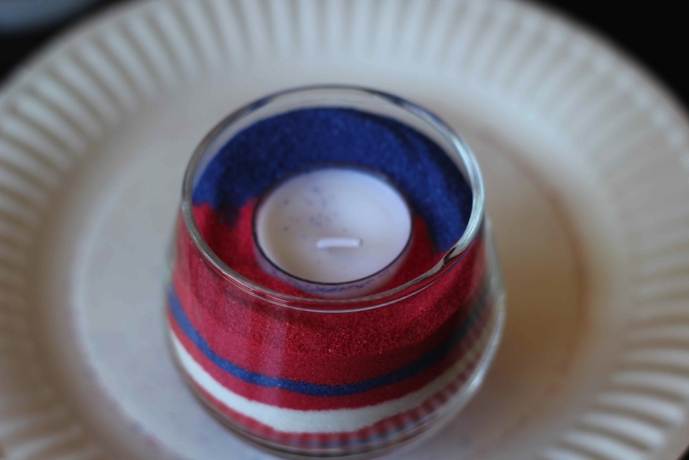 2) Layer sand with desired colors up to the top of the candle. Only the wick should be showing.