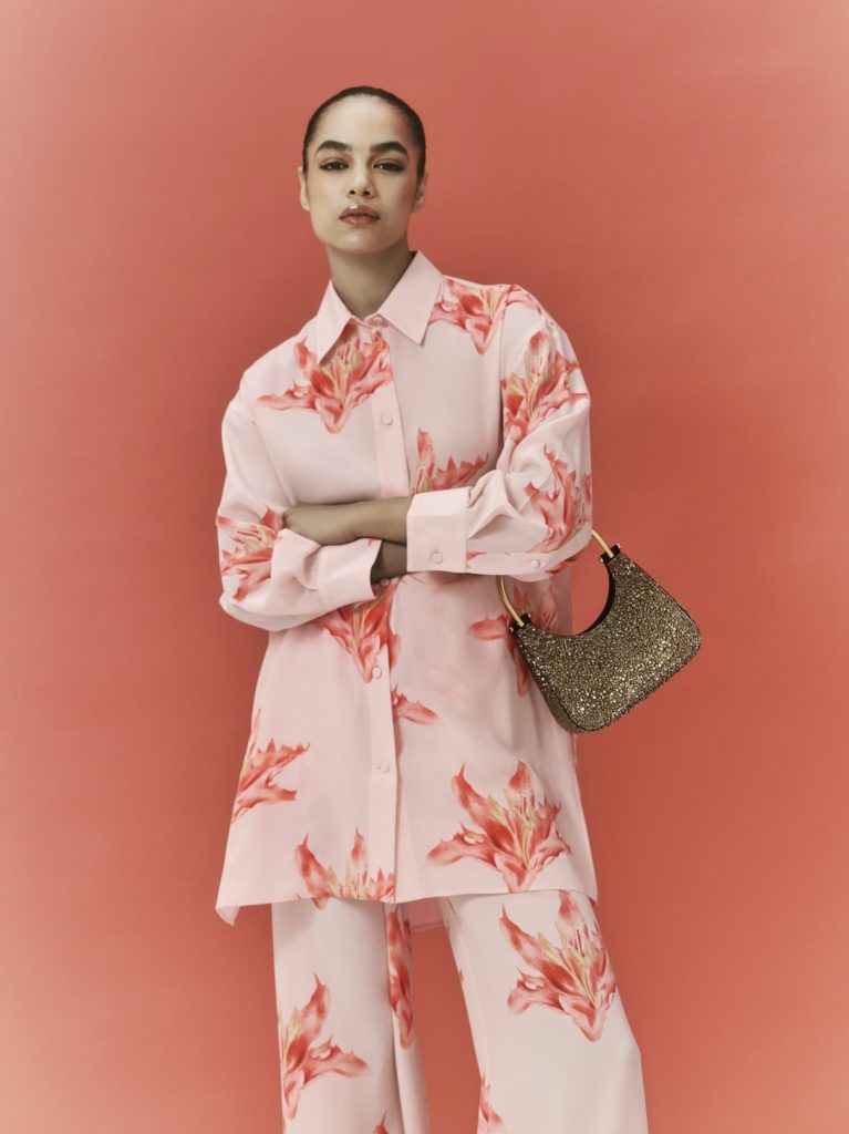 The six-piece line includes a blush crepe de chine tunic with a sculpted neckline and matching trousers, as well as accessories to complement the refined aesthetic, featuring the T-Bar clutch in black suede with gold embellishments.