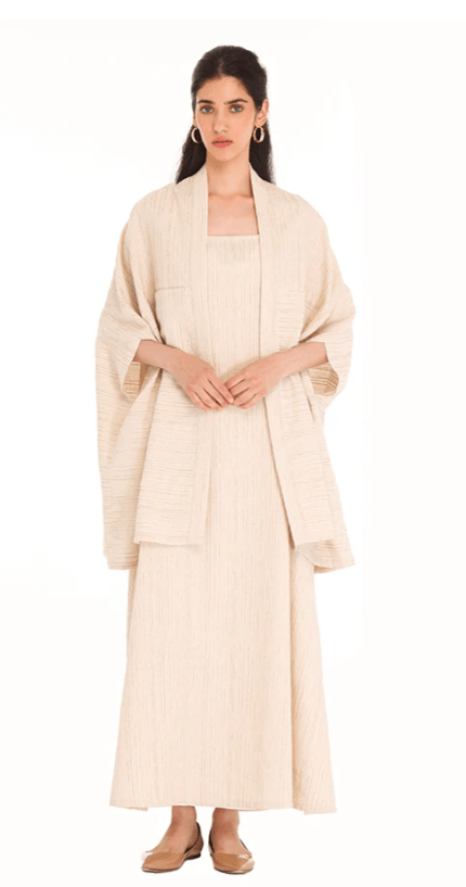 For Ramadan 2025, Loro Piana’s collection is built around soft silk-wool blends, featherweight cashmere abayas, and structured linen tunics in earthy neutrals, gold, and soft pastels.