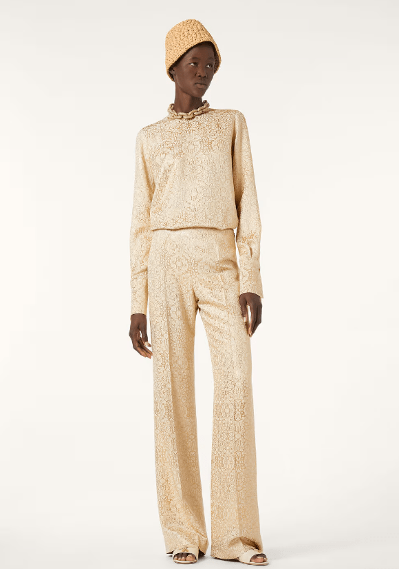 Subtle jacquard floral patterns add depth to the monochromatic pieces, while minimalist tailoring ensures timeless appeal, embodying Loro Piana’s signature quiet luxury.