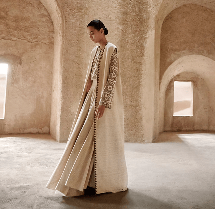 For Ramadan 2025, Loro Piana’s collection is built around soft silk-wool blends, featherweight cashmere abayas, and structured linen tunics in earthy neutrals, gold, and soft pastels.