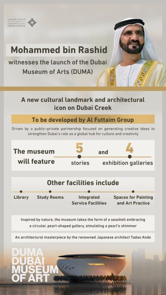 The most unique feature of DUMA is its location — floating on Dubai Creek. Inspired by Dubai’s pearl-diving history, the design incorporates symbols of the shell and pearl, honoring the city’s deep cultural roots. The museum will rise five stories above the water, with expansive galleries for exhibitions, and additional spaces for educational programs, artist talks, and art fairs.