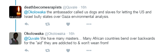 The comments were allegedly made after divisions arose over a certain environmental resolution concerning Gaza. Most delegates had left and the minimum number of votes required to officially pass the resolution was not met. According to Khamati, the Moroccan and Egyptian delegations thus wanted to nullify the resolution and a few of the African delegations tried to convince them otherwise, which is when the Egyptian diplomat in question switched to Arabic and referred to the others as “dogs and slaves”.