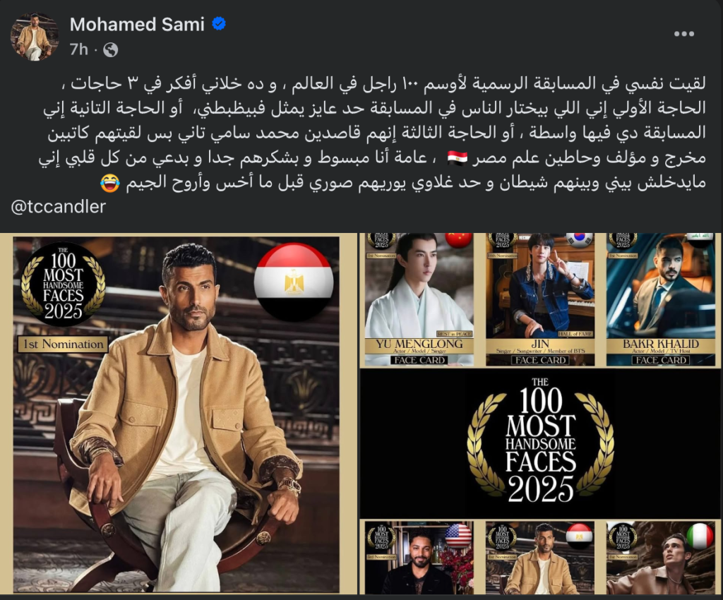 Egyptian director and screenwriter Mohamed Sami has been included in the 2025 edition of the “100 Most Handsome Faces” list, published by the international platform TC Candler.
