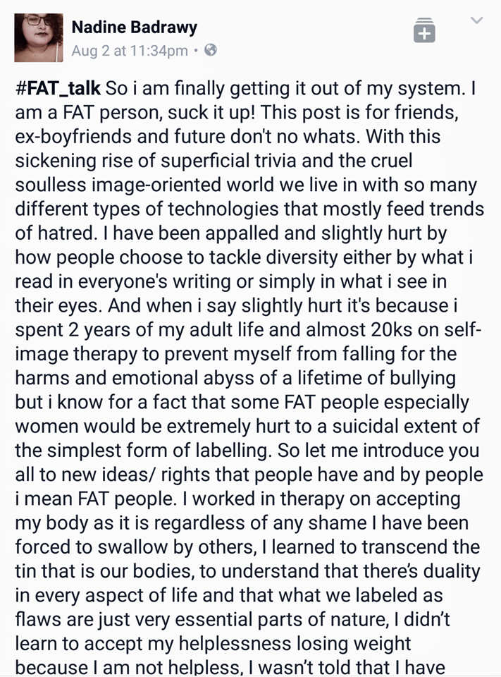 Facebook user Nadine Badrawy has decided to finally address all the body and fat shamming that happens in Egypt, with a brave and confrontational tone.