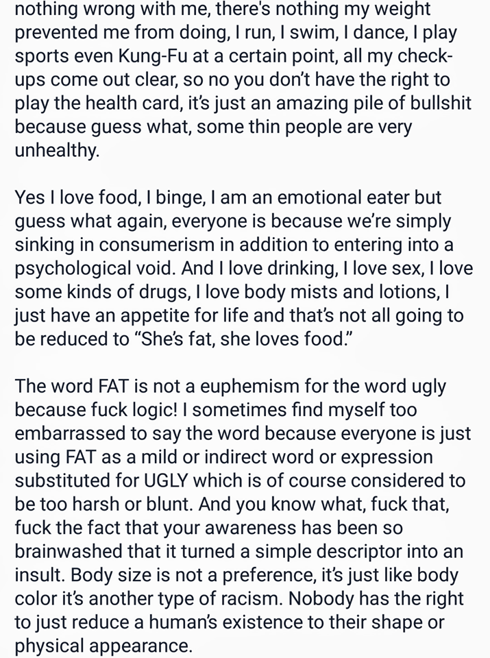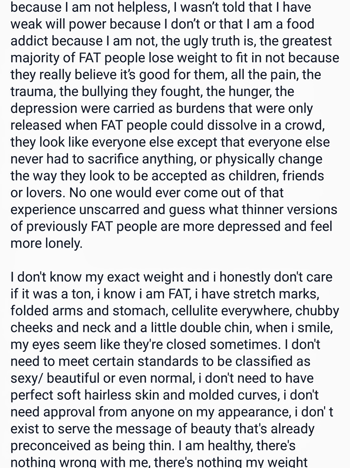 I don’t know my exact weight and i honestly don’t care if it was a ton, I know I am FAT, I have stretch marks, folded arms and stomach, cellulite everywhere, chubby cheeks and neck and a little double chin, when I smile, my eyes seem like they’re closed sometimes. I don’t need to meet certain standards to be classified as sexy/ beautiful or even normal, I don’t need to have perfect soft hairless skin and molded curves, I don’t need approval from anyone on my appearance, I don’ t exist to serve the message of beauty that’s already preconceived as being thin,” Nadine writes.