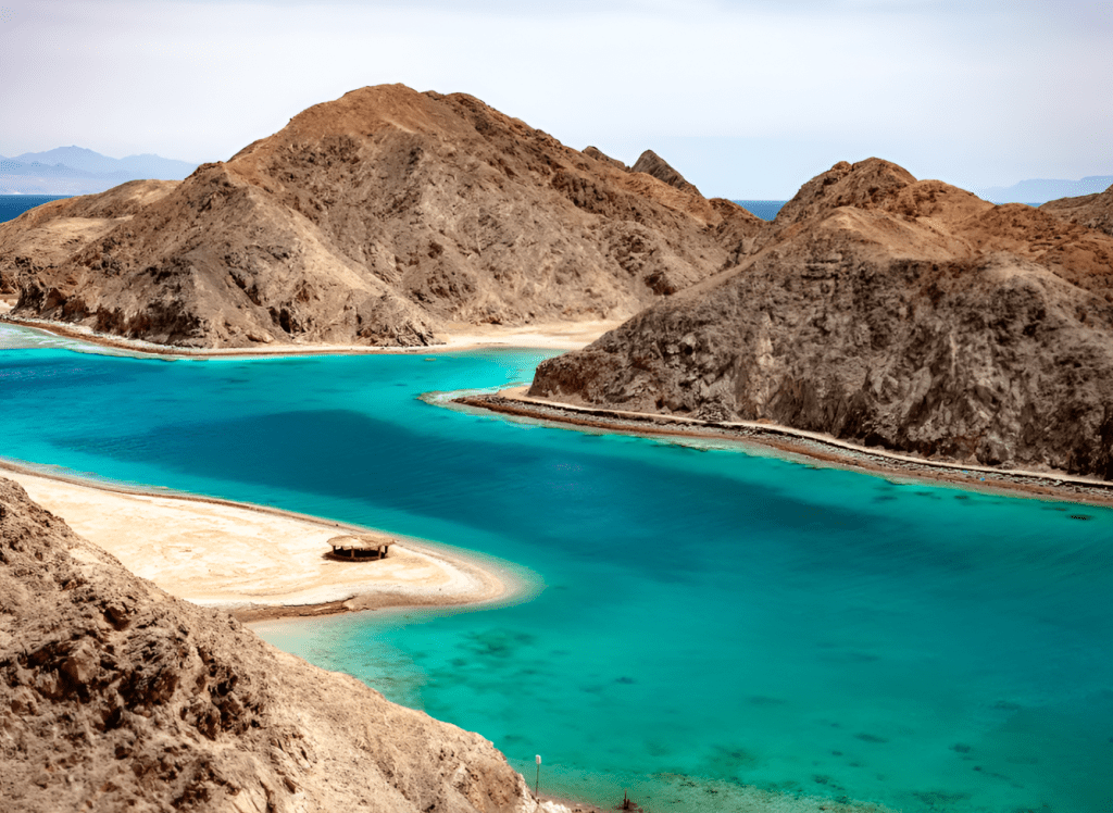 Ras Shitan, just a short drive from Nuweiba, is one of Sinai’s most striking coastal spots. Its name, meaning “Cape of the Two Beaches,” comes from the rocky headland that divides the shoreline into two parts. With the Sinai mountains rising behind and the Red Sea stretching ahead, the landscape is dramatic and serene all at once.