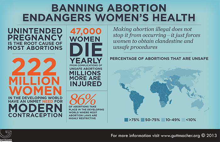 Abortion is a medical procedure, when a medical procedure is banned healthy women have to choose to either have at home abortions — by taking pills — or by going to underground clinics that lack sanitation and trained medical personnel, or to simply have an unwanted child.