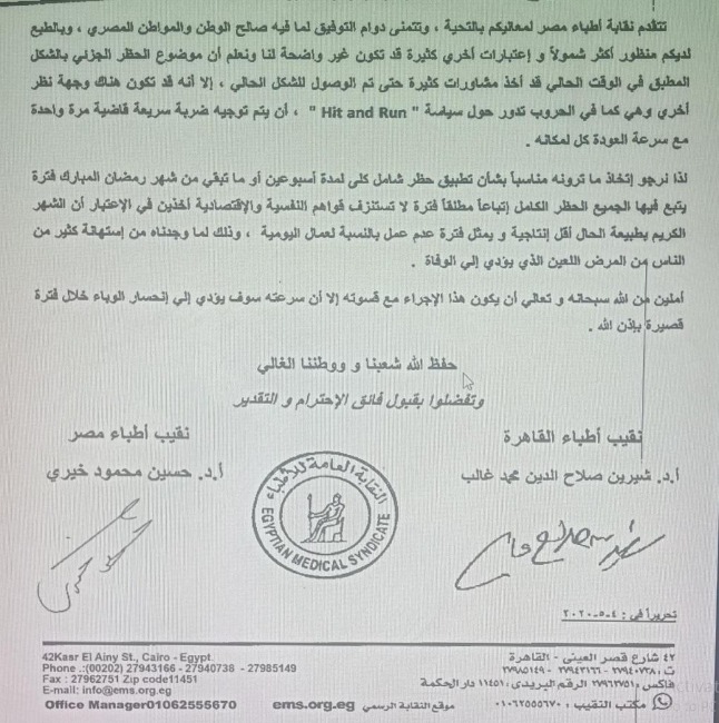Since Saturday, a letter signed by Dr Hussein Khairy, President of the Egyptian Medical Syndicate, and Dr Sherine Ghaleb, President of the Medical Syndicate in Cairo, has been circulating on Facebook. The letter was directed to Dr Mostafa Madbouly, Egypt’s Prime Minister, and suggested that the government impose a nation-wide lockdown for two weeks.