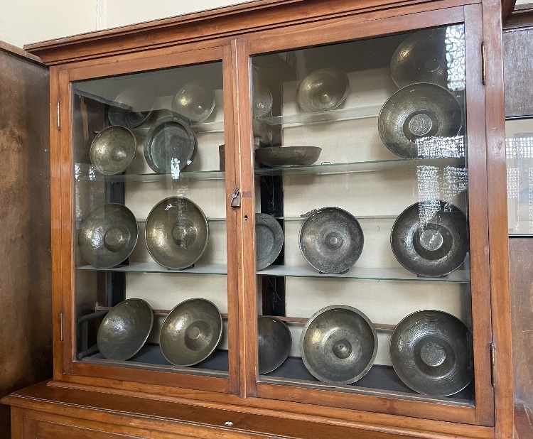 Yet, what is special is that laying behind a display case in that same room are several copper pans. El Wesemy told me how in Arabic they are called Tasat El Khada meaning shock pans. The residents of the house would fill them with water and seven dates and leave them overnight on the roof. Then they would spill the water on the face of the person they believe is cursed. The resulting shock supposedly cures the curse.