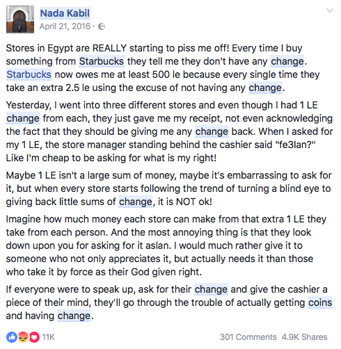 This happened to all of us. You buy something, you pay for it, the cashier is supposed to give you back EGP 8 but he/she only gives you 5 EGP. He/She doesn’t say anything, he/she doesn’t address the fact that he/she is out of coins, he/she simply assumes that you will either not notice or you’re okay with it because c’mon it’s only EGP 3, which is nothing to you.