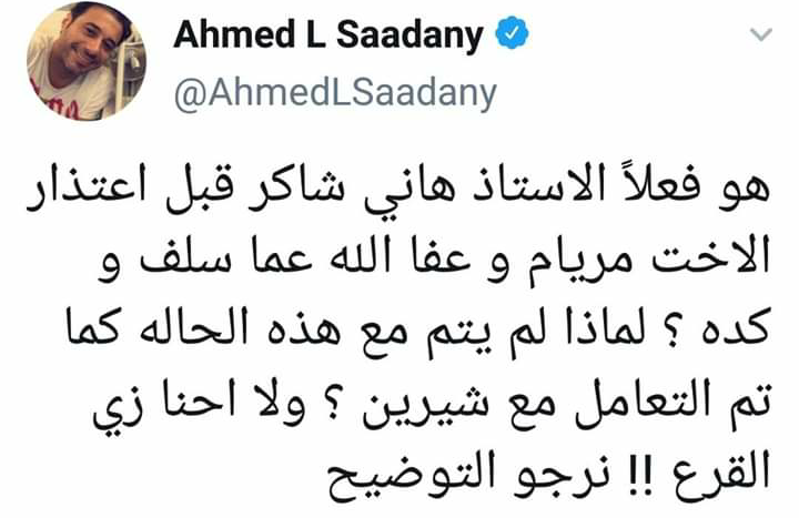 The syndicate added that Sherine Abdel Wahab insulted Egypt in public statements more than once, claiming they were not subject to any misunderstanding. Masrawy further reported that Shaker, along with the head of the Actors Syndicate, Ashraf Zaki, had a meeting with Abdel Wahab and her husband Hossam Habib. The singer was supposed to publicly apologize in a video to Egypt, yet failed to do so due to her busy schedule.