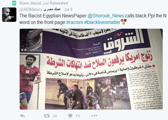 And while international organizations and movements like “Black Lives Matter” have been campaigning against racism and violence against black people, here in Egypt El Shorouk News decided to embrace the racism by publishing the news of the shooting and using the derogatory N-WORD on the FRONT PAGE HEADLINE!