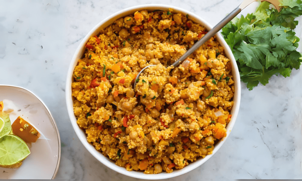 This type of Moroccan couscous is packed with roasted vegetables and chickpeas. It is the ultimate quick and healthy recipe packed with flavor.