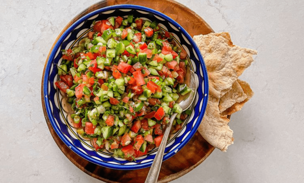 When devouring such meaty dishes, you’ll need something fresh to lighten up your meal. That is where a salad can come in, not just any salad but Palestine’s very own salata falahiyeh (farmer’s salad). Around the world, there is always some version of the iconic duo of tomato and cucumber salad, and Palestine is no exception.