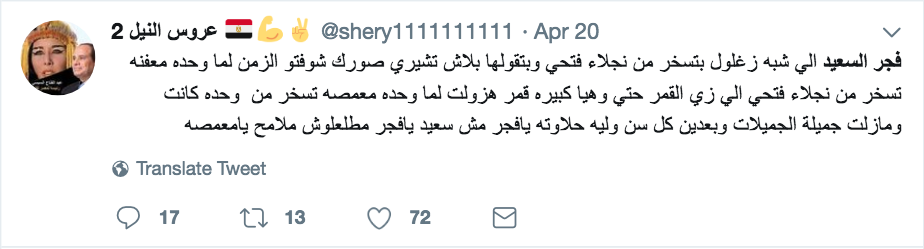 She bluntly addressed Fajr warning her to steer away from Egyptian artists as they all have a “natural Egyptian beauty unlike plastic surgery filling or any other beauty enhancements”، adding, “Najlaa is a gorgeous woman and social media has become a dumpster”