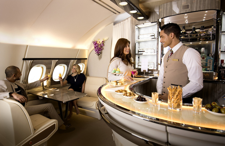Well, well, well! The sky-high bars on Emirates’ flagship Airbus A380s are getting a whole new fabulous look – and, like the airline’s forthcoming first class suites, it’s a style “inspired by private yacht cabins.”