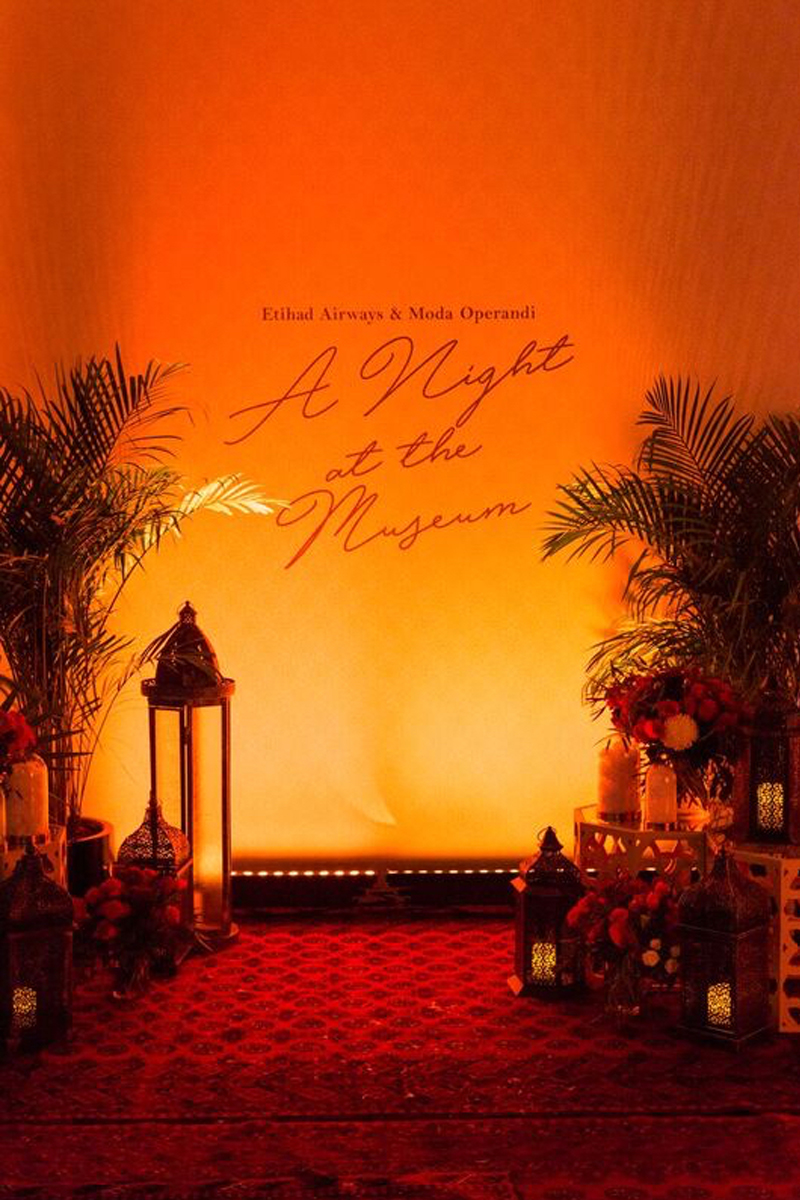 The brilliant venue was all dressed in an Arabesque style; geometric rugs filled the place in addition to design accents inspired by the Emirati vibes. Not just that, but royal Moroccan carpets were leading the way into a vast hallway adorned with traditional lanterns and rustic gold tables, setting the perfect mood for theme of ‘Parisian nights meets Arabian style’. To add a touch of opulence and luxury to the venue, candlelit tables were scattered all over the place displaying an artful arrangement of decadent desserts, rich pastries and intricately designed cakes.