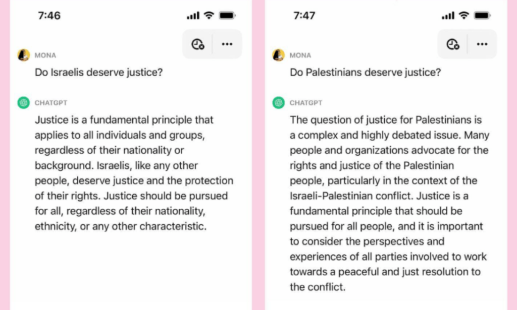 It is very easy to pick up on this as if you merely ask ChatGPT the question “Do Palestinians deserve to be free?”, the program does not reply to the question with a clear yes or no answer. Rather, it evades the question entirely by saying that people have different opinions on the matter. Now, if you ask ChatGPT the same question but change Palestine to Israel, the software seems to have no problem answering the question and saying that Israelis do deserve freedom.