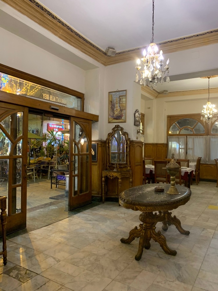 Opening its doors in the 1960s, Gaber told us how Akher Saa is the beating heart of Downtown Cairo, everyone knows it and loves it. That’s the thing about Alfy street in general, many of its restaurants are deeply rooted in the history of the neighborhood. Our next stop was the timeless classic eatery known as Restaurant Alfi Bey, dating back to 1938, the entire spot exuded a vintage feel with its interiors made up of marble tables, hung portraits and even a mini antique gold-rimmed mirror. The coolest part was that they even had an old black and white framed menu that showed prices from 1938. Back then, an entire chicken cost 12 sagh (about 12 pennies).