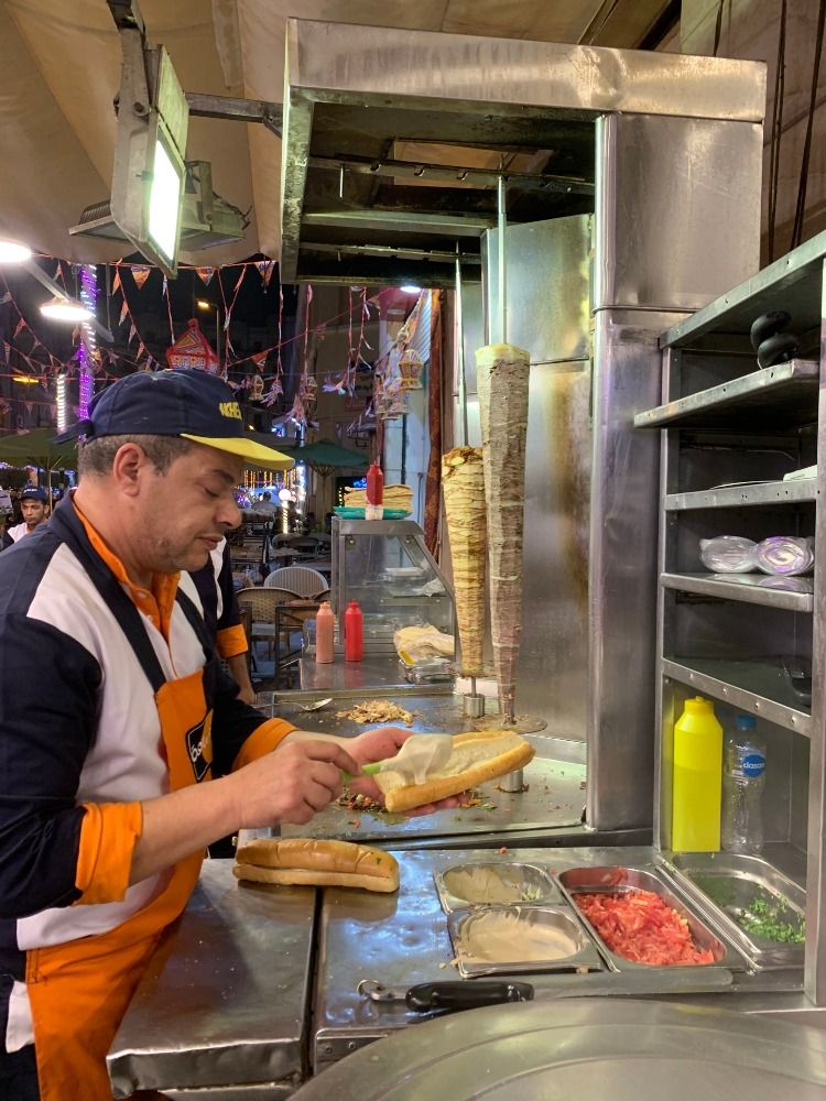 As we began strolling through Alfy Street, one place in particular caught our eye, it was called Akher Saa (The Last Hour). This fast-paced eating hub was home to multiple cooking stations ranging from a four-person shawarma station to an egg and foul station where the sound of sizzling oil mixed in with the chatter of diners and waiters.