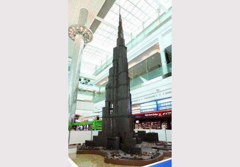 Dubai Airport revealed a chocolate replica of the Burj Khalifa that stood at 13.52 meters tall. The project required 500 tonnes of chocolate cubes and took 1050 hours of work to complete.