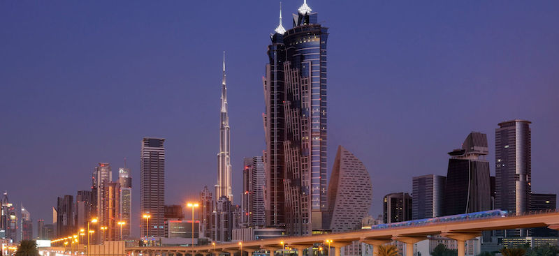 The record belongs to the JW Marriott Marquis Hotel, which stands at 355.35 m from the ground level to the top, the hotel itself is actually made up of two towers, each with 77 floors.