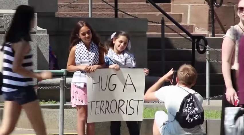 Two Palestinian-Syrians school girls in Canada hold up a sign saying “HUG A TERRORIST” in response to the civilian deaths in Gaza.