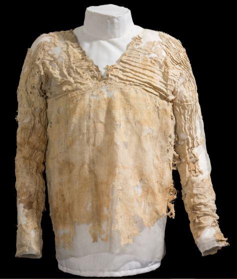 Tailored from fine linen with narrow pleats, a V-neck, and fitted sleeves, the dress reveals astonishing sophistication for its age. Unlike most ancient textiles that crumbled long ago, this one survived almost intact — creases at the elbows and armpits even suggest it was once worn by someone of high status.