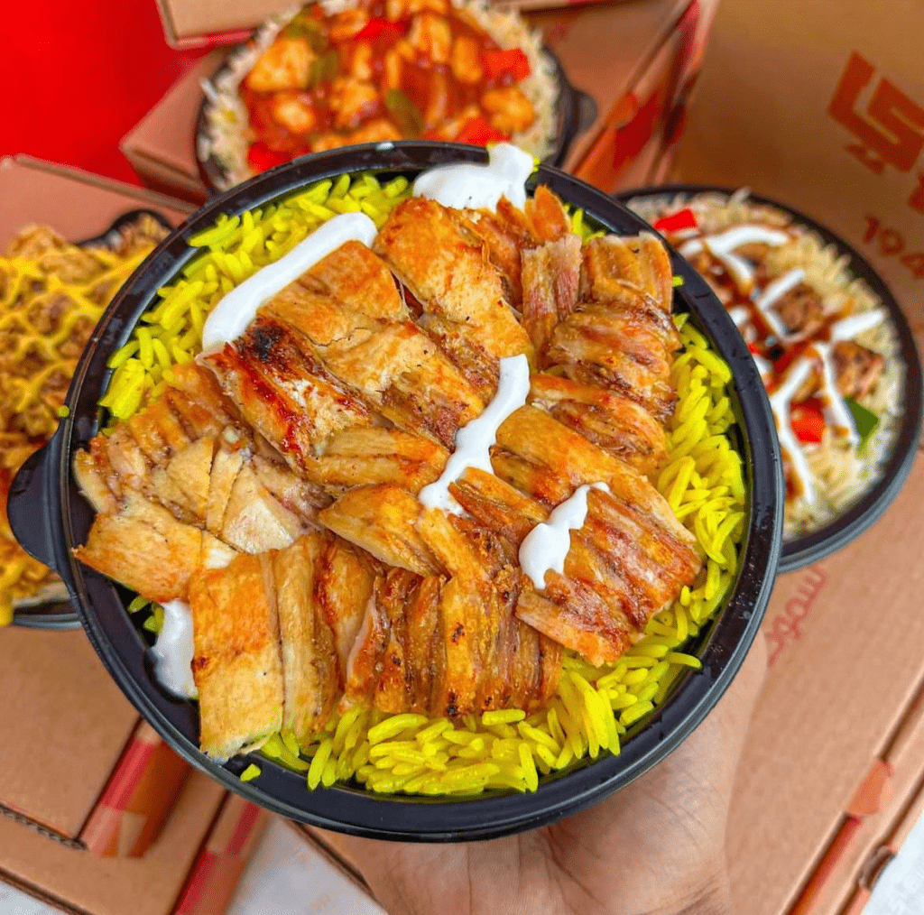 - Assemble & Serve – Layer bread, rice, chicken, and top with sauce. Done!